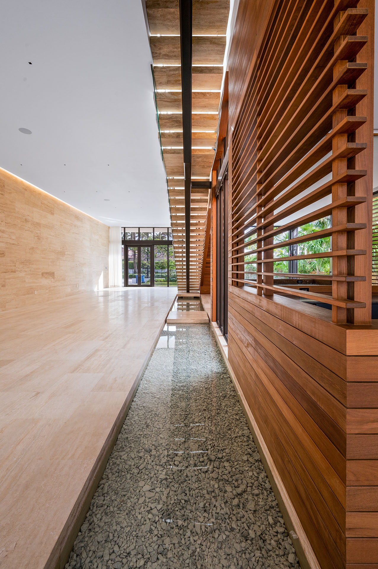 While she looked on in bewilderment, I started to sketch the concept. My idea was to have wooden pavilions that appear to hover, surrounded by aqua water, inspired by the iconic Bora Bora resort bungalows. Thinking of how this could translate in a home, while blending interior and exterior living, I recalled Will Smith’s former Greenwich Village home, which was around the corner from where I used to live and work in NYC and that had a stream of water running through the living room. I feverishly drew the concept with floating wooden pavilions and water running through the home, which I located under a floating stone-clad stair and with landings that act as stepping stones over the water. Then I digitally modeled my idea. As one of the last projects I worked on as the Project Architect at Oppenheim Architecture + Design before departing and turning my part-time practice of Pravda Architecture/Design, PLLC into a full time business, I presented my concept to the clients, while my colleagues presented an alternative concept for consideration. The clients directed us to proceed with Bora Bora.