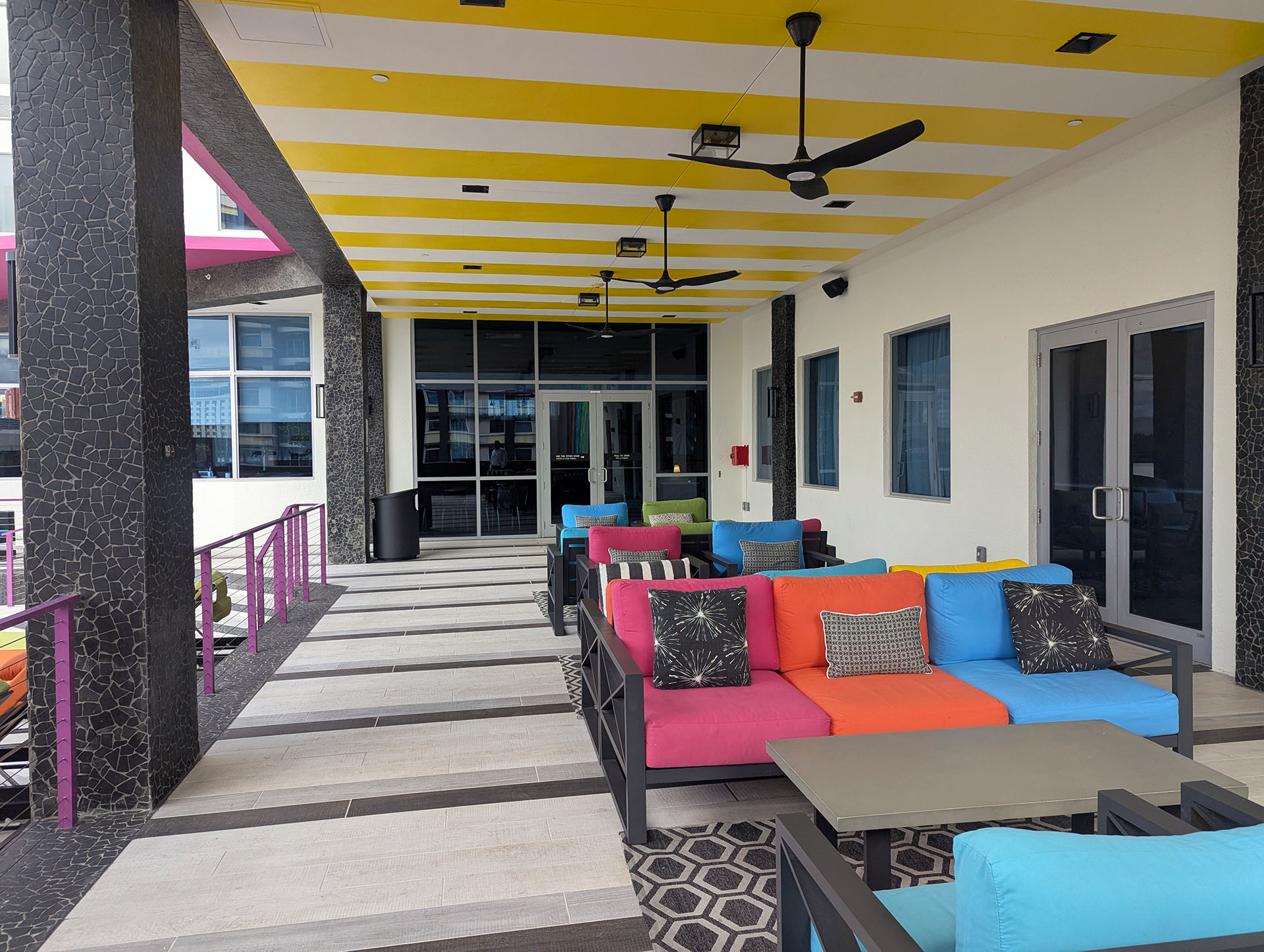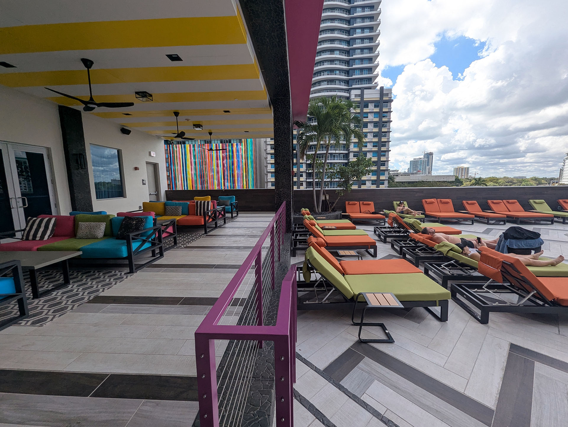Can you hear the music?  Feel the vibe? Welcome to Miami. We took an ordinary, somewhat dreary rooftop pool deck at the Hampton Inn Brickell location in downtown Miami, and made it a lively, memorable, and highly used space. Previously, 4’ tall fencing and vertical bared gates imprisoned the pool, but we shifted the pool barrier to the rooftop’s entry/ exit doors and added electronic locks to comply with pool barrier requirements of the Building Code. This allowed us to open up the space, with lower minimalist railings and more grand steps that lead you to the water. While we admittedly first approached this project, thinking of muted, natural tones to bring a location of calm and relaxation amidst the bustling City, our client encouraged us to pivot- to embrace the urban chaos, to make it special and make it fun! We created a design that is completely of its place and uniquely Miami. Inspired by the bright pinks and blues of the Miami Heat’s Miami Vice jersey, the site’s surrounding colorful artwork, and the distinctive location with Miami’s rich art deco history and South & Central American cultural influences, we conceived a space with flavor and flare- a space you will not see at any other Hampton Inn. Using graphics, color, and high-end materials, this pool deck is a space to enjoy. When you come outside on the 6th level, in the middle of the City, you know you have arrived. Bask in the sun, take a dip in the pool, and smile. Whether you’re here on vacation, for business, or for a special event, you’ve arrived, and you’re exactly where you’re supposed to be.